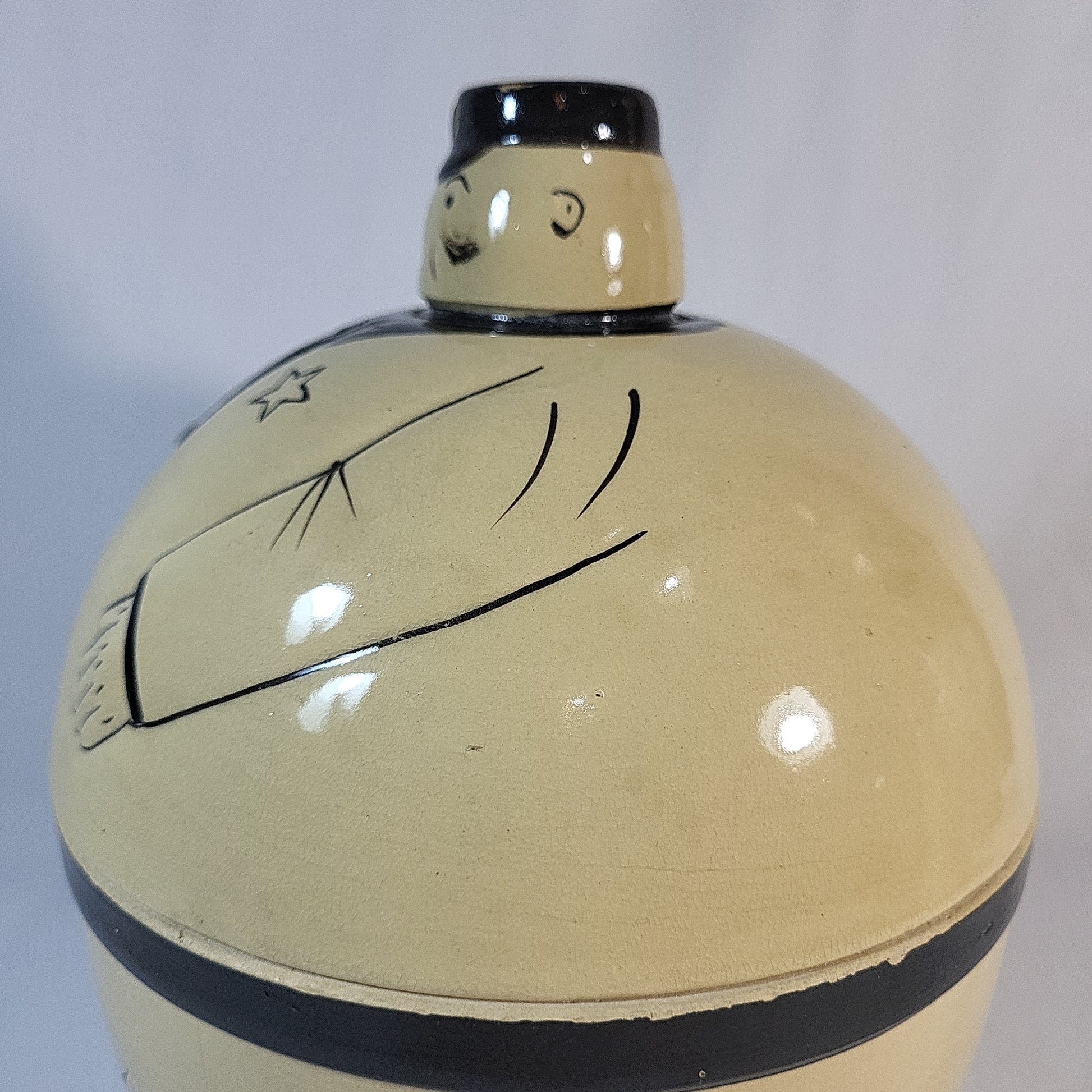 The jar is in decent condition. It does have a bit of wear and tear with a few chips and crazing but doesn't have any cracks or repairs.